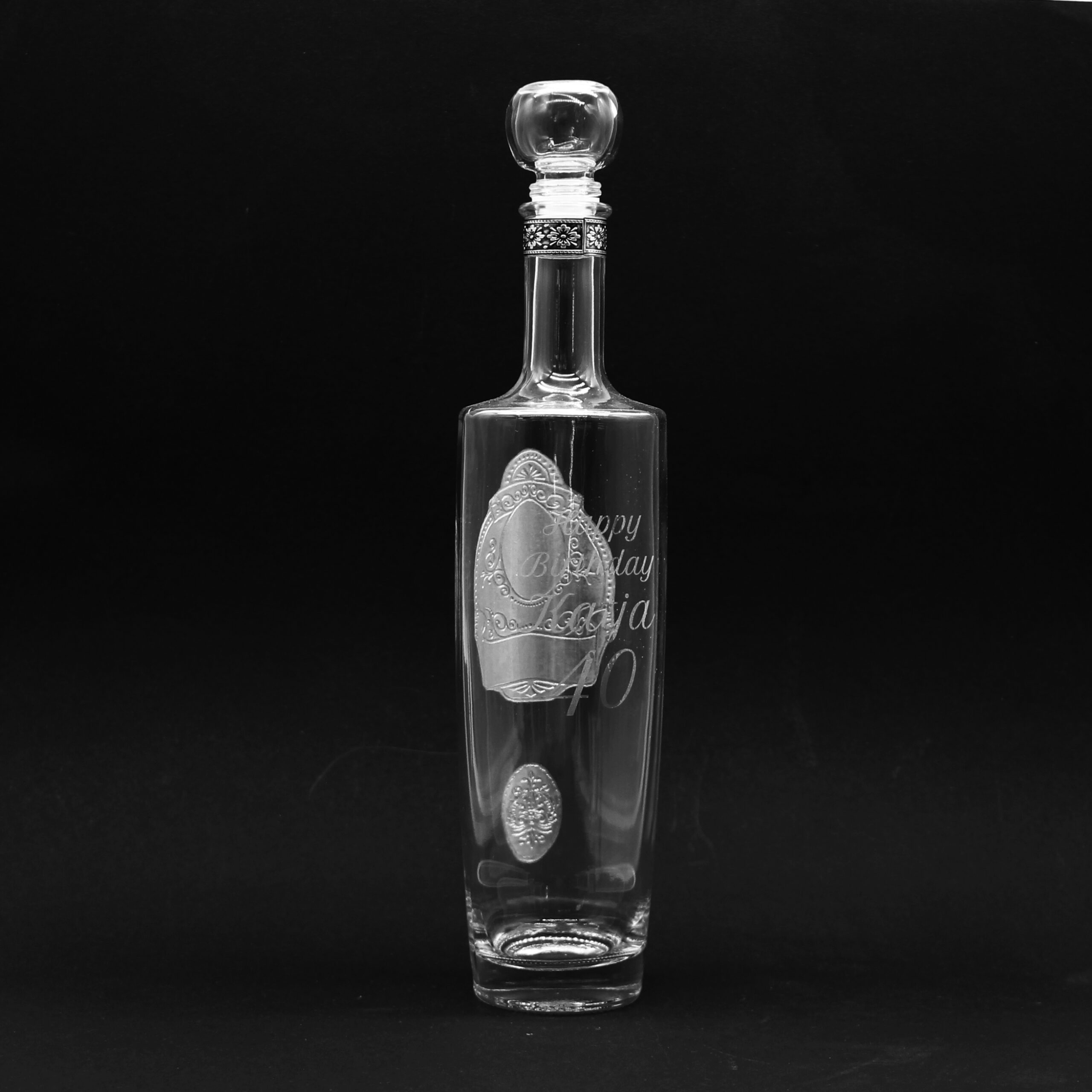 Magas és elegáns pálinkás üveg ón mintával díszítve.