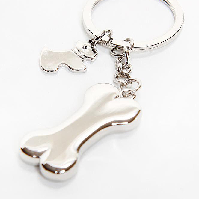Csont alakú kulcstartó egy pici kutyával.