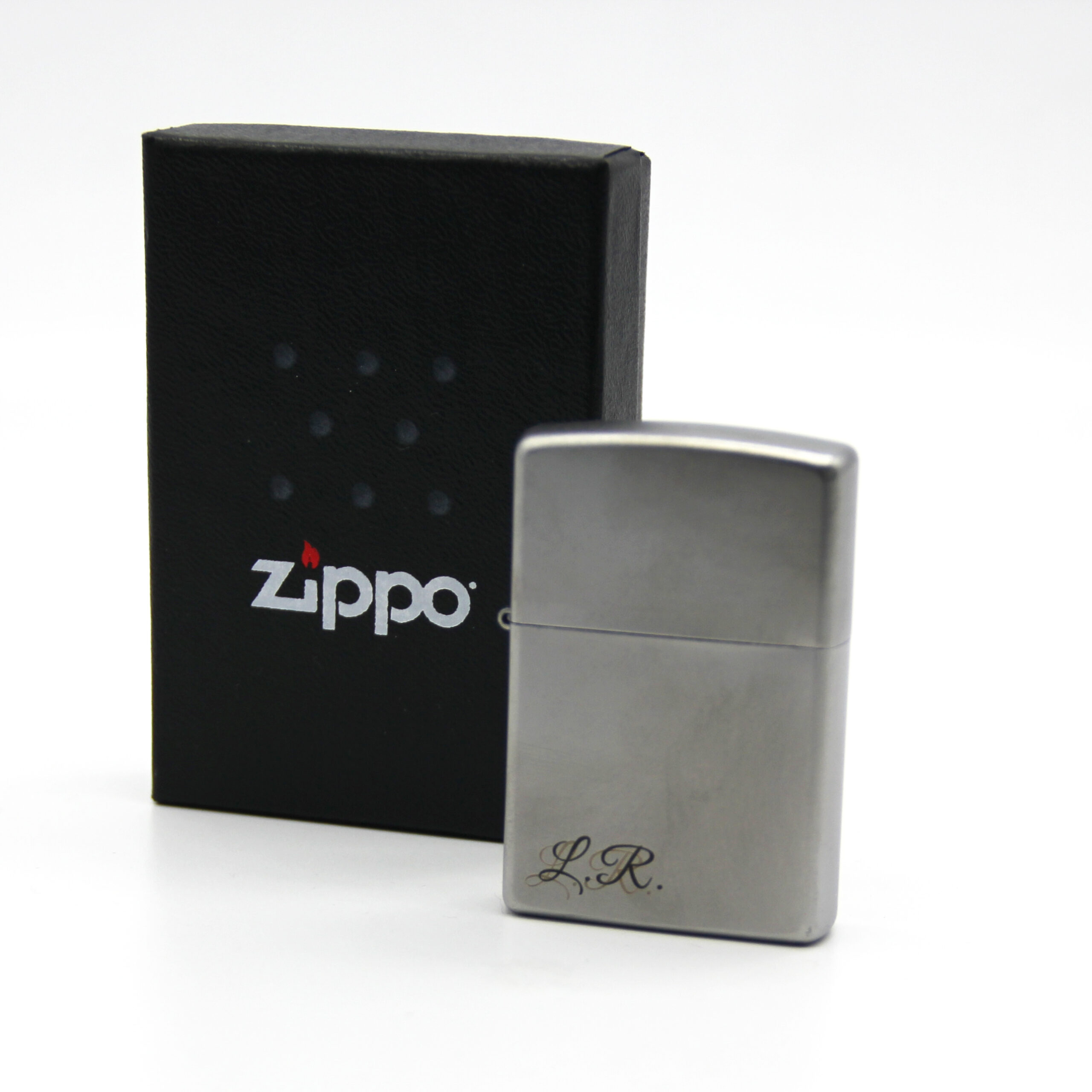 A Zippo 205 szatén ezüstszín öngyújtón a képen is látható L.R. gravírozás van.