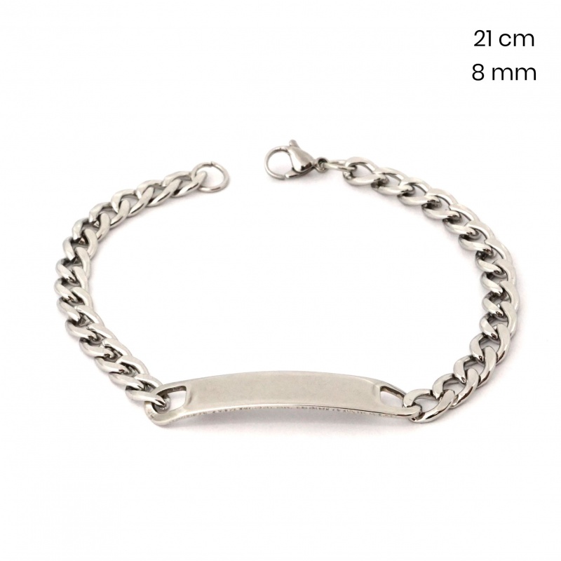 Divatos nemesacél karkötő. Lekerekített szélű, téglalap alakú fejrésze alkalmas gravírozásra is, így egy igazán egyedi ajándék lehet a szeretteink számára.