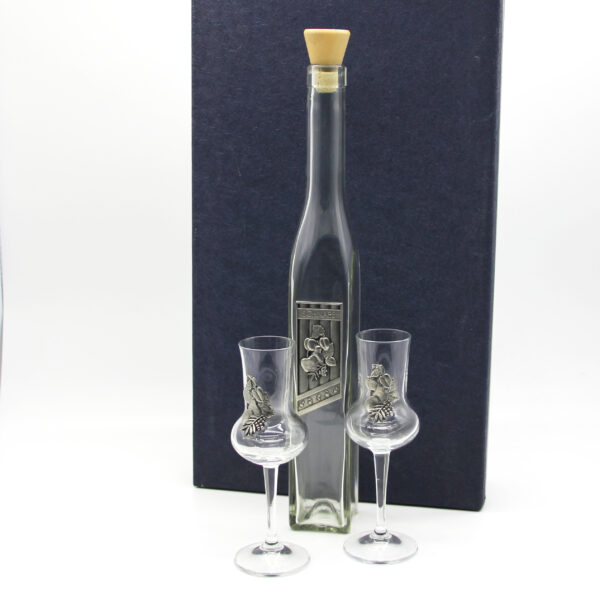 Pálinkás üveg ón rátéttel és 2 db pálinkás pohárral, díszdobozban.