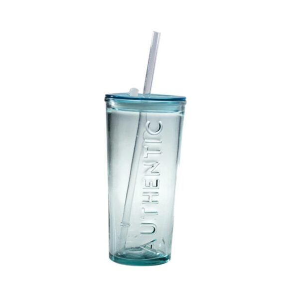 A szívószálas üvegpohár praktikus és környezetbarát.