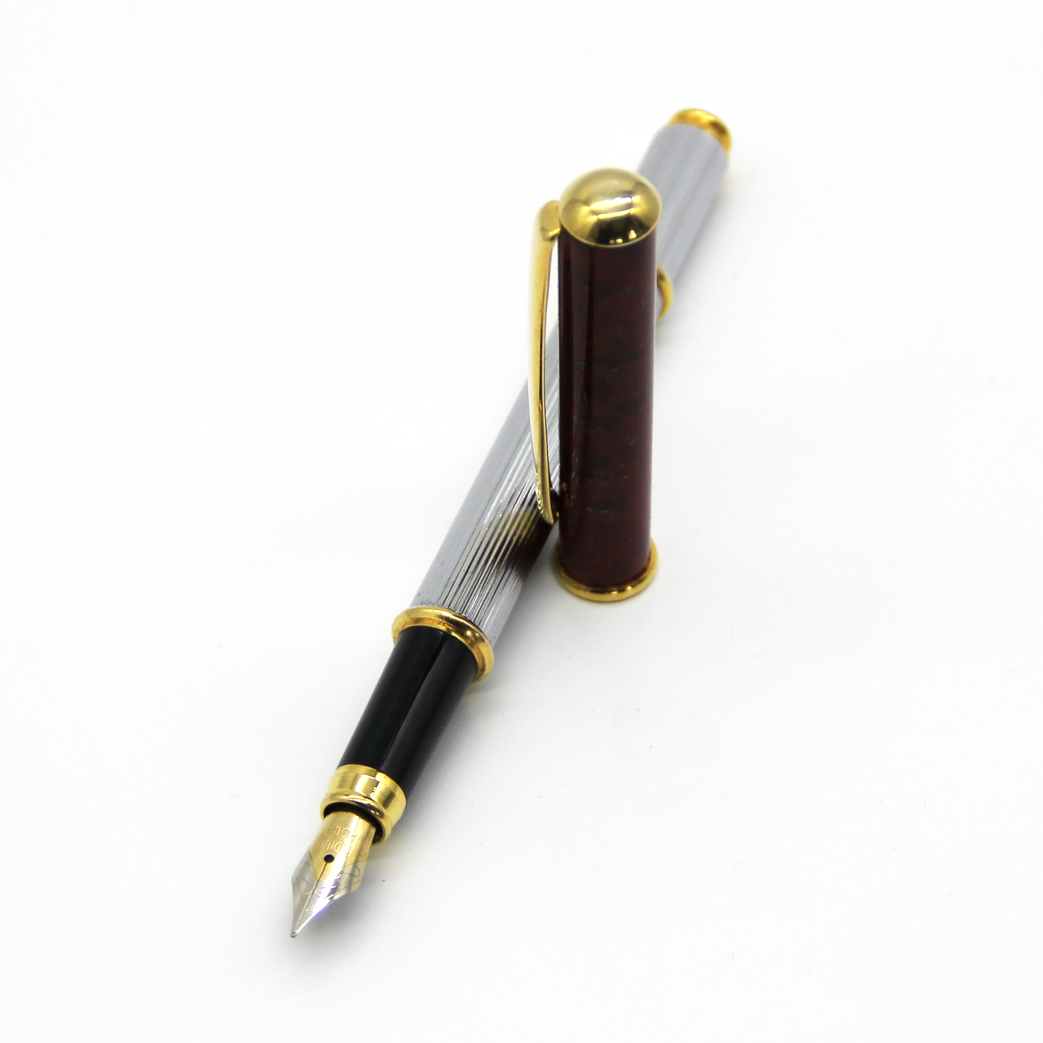 A töltőtoll kupakjának színe bordó, márvány mintázattal. A toll rész ezüst színű, anyagában csíkozott. A klipsz és a dekorációs kiegészítők elegáns arany színűek. A töltőtoll standard tinta patronnal használható.