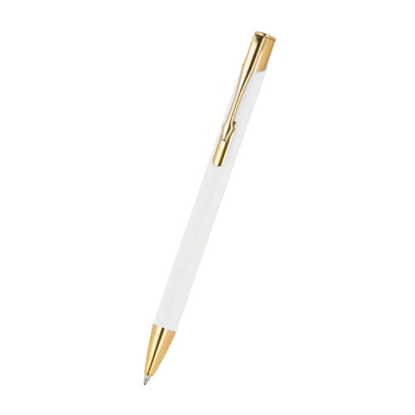 Elegáns fehér színű golyóstoll ragyogó arany színű kiegészítőkkel. Tökéletes választás elegáns nőknek, akik szeretik a kiemelkedően szép tollakat és az egyéniséget tükröző kiegészítőket.