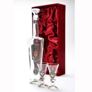 Pálinkás üveg + 2 db füles pohár díszdobozban gravírozással